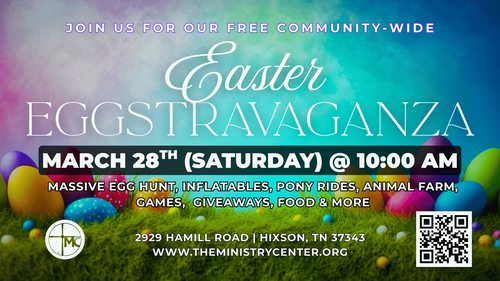 Spring is almost here, and we are excited to invite you and your family to one of our favorite events of the year at The Ministry Center. Our annual Easter Eggstravaganza is happening on Saturday, March 28 at 10:00 AM at 2929 Hamill Road in Hixson, and it is completely free for the entire community.