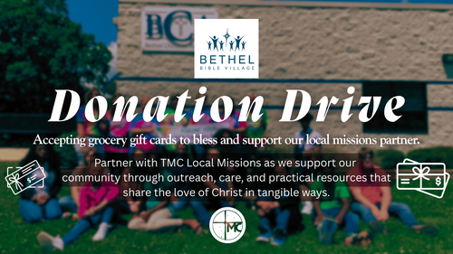 During the month of September, TMC Local Missions is partnering with Bethel Bible Village to support children and families right here in our community. We are collecting grocery store gift cards to help meet their daily needs and show the love of Christ in a tangible way.