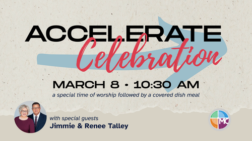We are excited to invite you to our Accelerate Celebration on March 8. This special worship service will be a time to thank God and celebrate an incredible milestone in the life of our church as we rejoice in becoming debt free.